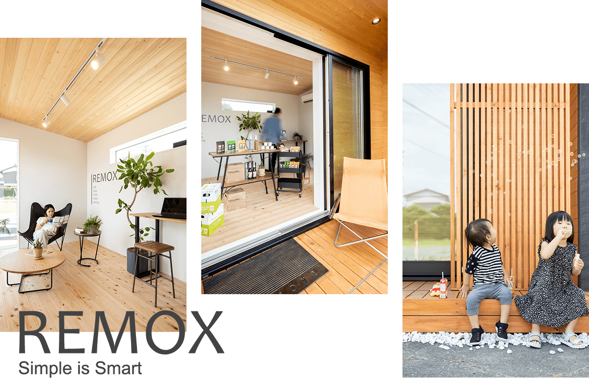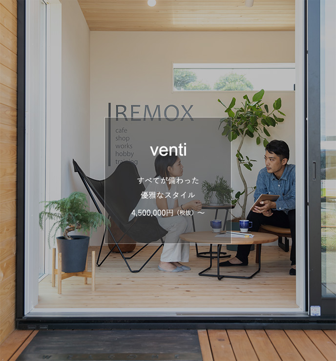 REMOXは、2×4構造により耐震性を兼ね備えた建築確認申請が不要な簡易かつデザイン性ある木造建築ハウス。venti・mezzo・minimoと用途に合わせた3種類のパッケージを提供します。