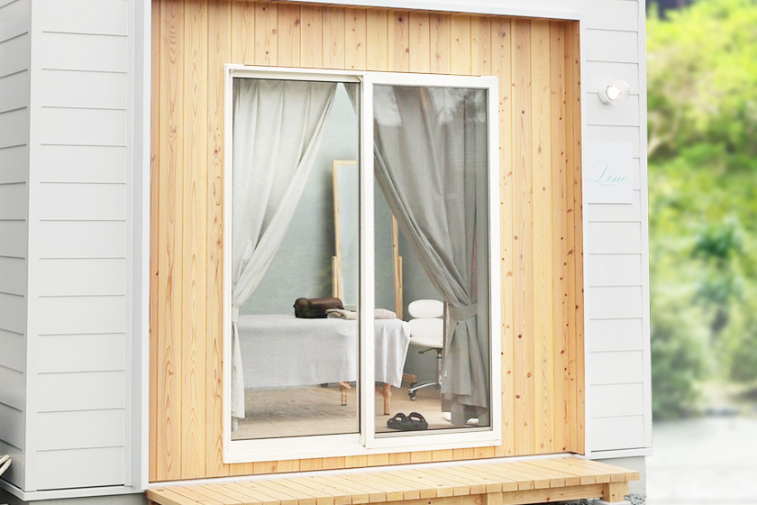 今回は女性のみを対象としたサービスを展開していくため、室内にはプライバシースペースの確保をすること、デザインは女性が落ち着いて施術を受けられる色合い、配置を優先して設計いたしました。余計なものは置かず、6畳の室内を無駄なくサロンスペースとして活用できるプランニングになりました。母屋とは離した位置に店舗を構えたことで、生活圏が重ならずストレスなく仕事ができることだけでなく、独立した店舗として捉えられるため、高単価のサービスが展開できます。自宅サロンの開業を叶えたオーナーママ。家族の時間と仕事の本当の両立が叶えられるようにと、そんな思いで手掛けさせていただきました。